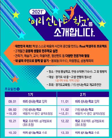 미리신나는학교는 1기 9월~10월, 2기 11월~12월 두 차례 운영하며 기수별로 도내 중·고 학생 각 20명이 기숙사 생활을 하면서 참여한다.