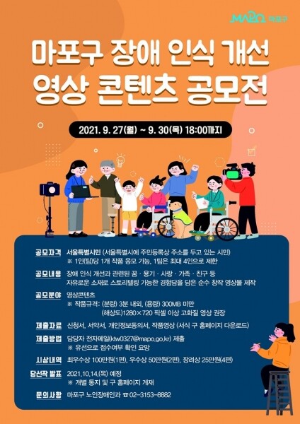 유동균 마포구청장은 “이번 공모전에 장애에 대한 인식을 개선할 수 있는 창의적인 작품들이 출품될 수 있도록 많은 참여 바란다”며 “선정된 영상들을 적극 활용해 장애인과 비장애인이 더불어 살아가는 따뜻한 마포를 만들도록 최선을 다하겠다”고 말했다.