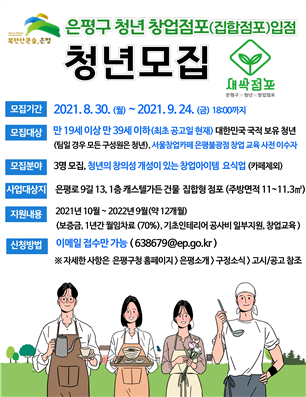 아울러 이번 모집에는 청년들의 성공적인 창업을 위해 서울창업카페 은평불광점에 개설된 사업계획서 작성법 등 창업 교육 6시간을 이수하고 교육 이수증을 제출해야 한다.