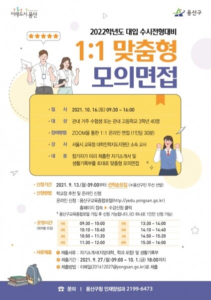 성장현 용산구청장은 “사교육비를 절감하고 공교육을 정상화하기 위해 지자체가 할 수 있는 일들을 적극 발굴 중”이라며 “대입 수능이 72일 남은 지금 수시를 준비하는 고3 학생들에게 가장 필요한 것은 모의 면접일 것이다.