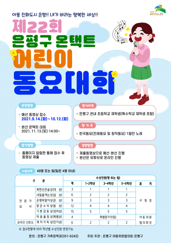 어린이들의 꿈과 맑은 동심을 노래하는 ‘은평구 어린이 동요대회’는 올해 22회를 맞는 유서 깊은 구 아동 행사 중 하나이다.