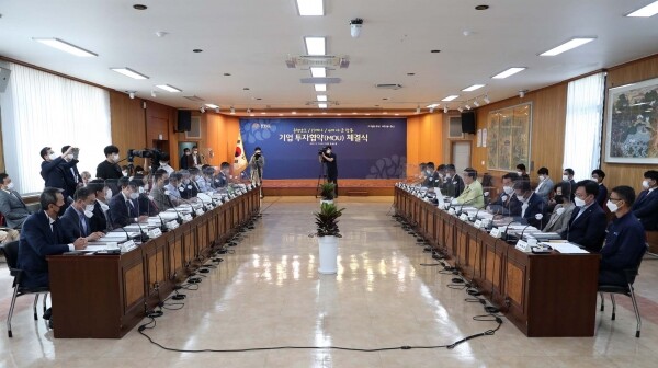 양승조 지사는 15일 홍성군청에서 김석환 홍성군수 등 4개 시군 단체장, 최규옥 오스템임플란트 회장을 비롯한 17개 기업 대표와 합동 투자협약을 체결했다.