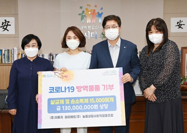 친환경 생활용품 전문 기업인 ㈜지투지의 전지영 대표가 친분이 있는 양차민 마리에뜨㈜ 대표에게 방역물품을 후원했다.