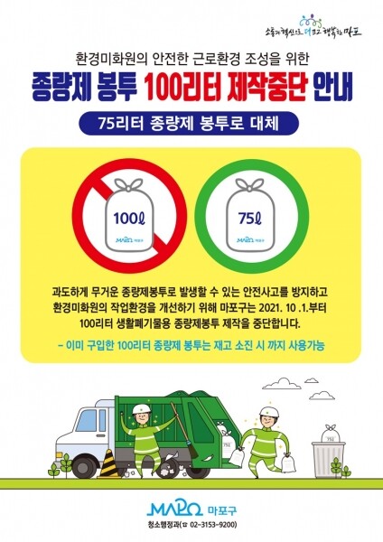 유동균 마포구청장은 “환경미화원의 안전한 작업환경을 만들기 위해 100리터 종량제봉투 제작 중단은 불가피한 결정”이라며 “구민 분들께서 다소 불편하겠지만 75리터 종량제봉투 이용에 협조해 주시길 바란다”고 말했다.