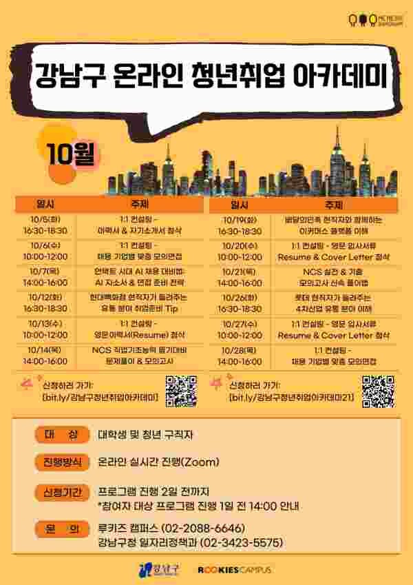 취업준비생이라면 누구나 온라인 화상회의 플랫폼 줌을 통해 참여할 수 있으며 강남구 청년취업아카데미 홈페이지에서 신청이 가능하다.