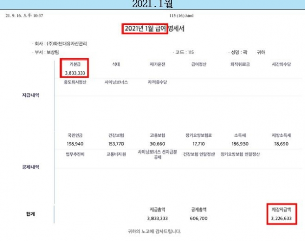 강 의원은 "조선일보가 지난 9월18일 곽상도 의원을 쉴드 치기 위해 공개했던 아들 곽 씨의 급여명세서를 근거로 통상임금을 산정하면 최대로 해도 2,500만원 정도"고 밝힌 뒤 "곽 의원은 화천대유에 투자한 바가 없다고 했다.