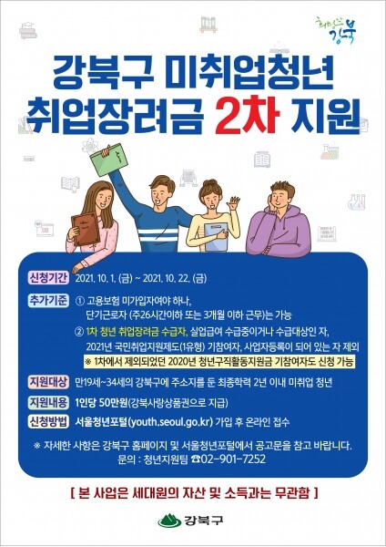 구는 보다 많은 강북구 미취업 청년들에게 혜택을 주기 위해 추가로 2차 취업장려금 지원을 운영한다.