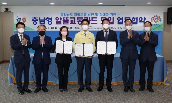 도는 8일 양승조 지사와 백승근 대광위 위원장, 박선영 한국교통안전공단 교통안전연구원 원장 등이 참석한 가운데, 도청 상황실에서 충남형 알뜰교통카드 도입을 위한 업무협약을 체결했다.