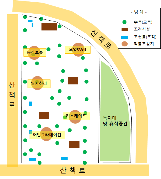 숲속에 누워 하늘을 바라볼 수 있는 오브제가 돋보이는 ‘수목연’ 숲 속에서 잠시 쉬어가며 풍경을 감상할 수 있는 ‘두 번째 풍경’ 휴식·예술·친환경 등 복합공간으로의 활용가능한 ‘Rest Art Re Start’ 답압으로 식물이 살기 어려운 공간을 생육공간으로 바꾸는 ‘나무사이’ 빗물을 활용한 식물친화적 정원인 ‘그 틈 사이로’ 등 다양한 의미를 담은 5개의 정원이 시민을 맞이할 예정이다.