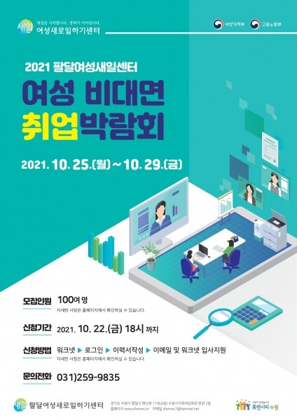 참여를 원하는 구직자는 오는 22일 오후 6시까지 워크넷에서 ‘팔달새일 비대면 여성 취업박람회’ 검색한 후 취업을 희망하는 기업을 선택해 신청하면 된다.