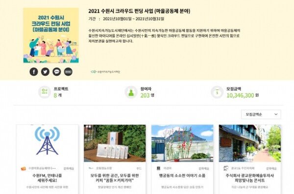 수원시지속가능도시재단은 ‘지속가능한 마을공동체’를 만들 아이디어가 있는 관내 마을공동체, 동 단위협의체, 사회적경제조직 등에 크라우드펀딩을 지원하고 있다.