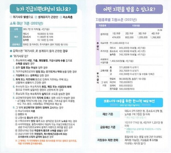 긴급복지지원 기준은 중위 소득 75% 이하 일반재산 2억원 이하 금융재산 4인 가구 기준 1231만원 이하로 완화된 상태다.
