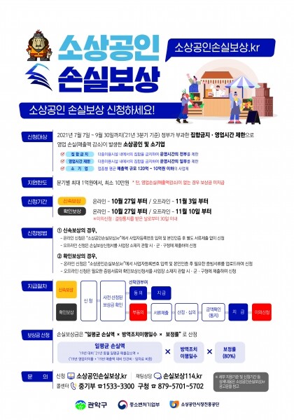 온라인 신청은 오는 27일부터 손실보상 누리집을 통해 할 수 있으며 지자체의 방역조치 이행 여부 및 국세청의 과세자료를 기반으로 구축된 신속보상 대상은 별도의 서류 없이 신청 후 2일 이내 지급된다.