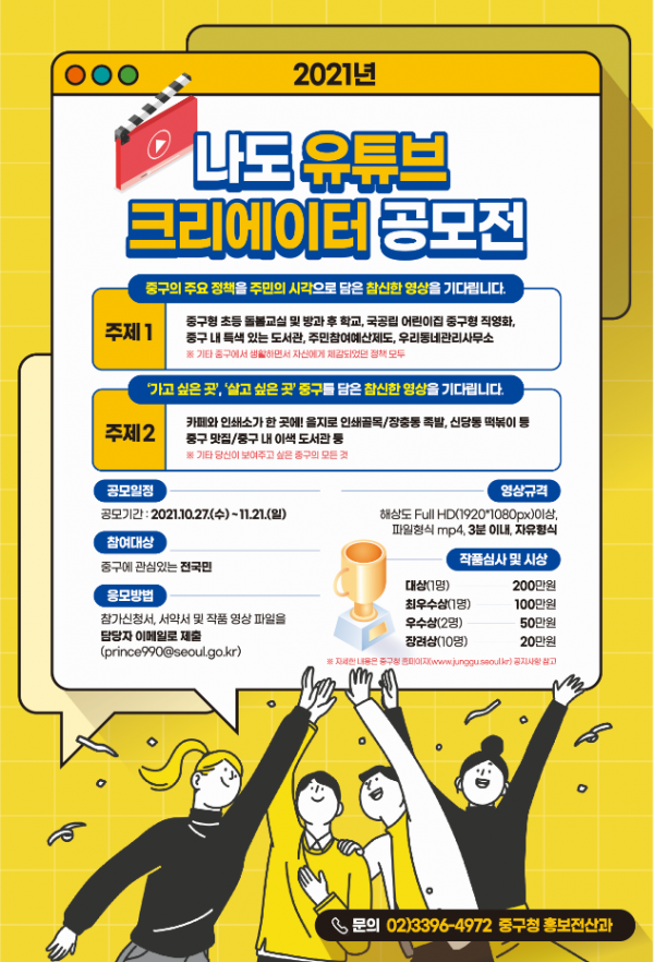 중구형 초등돌봄, 주민참여예산사업, 우리동네관리사무소 등 주민이 직접 체감한 구의 대표 정책이나 특화 사업 또는 남산, 을지로 일대의 명소나 맛집, 나만 알고 있는 숨겨진 핫플레이스를 각자의 개성을 담은 영상으로 제작해 제출하면 된다.