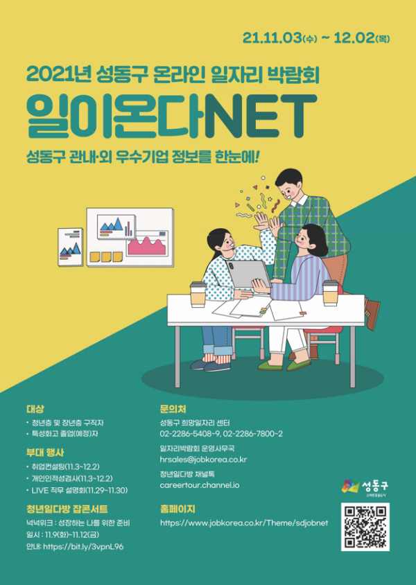 [무한뉴스] 서울 성동구는 이달 3일부터 12월 2일까지 언택트 일자리박람회 ‘일이 온다넷’을 개최하며 박람회에 참여할 구인 기업을 모집한다.